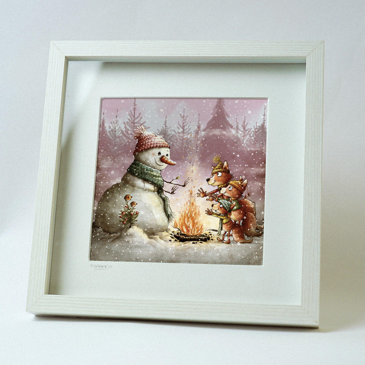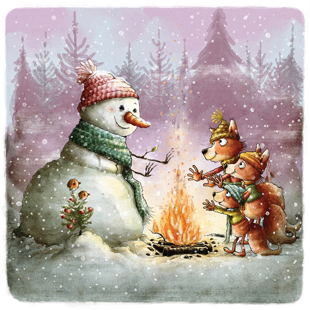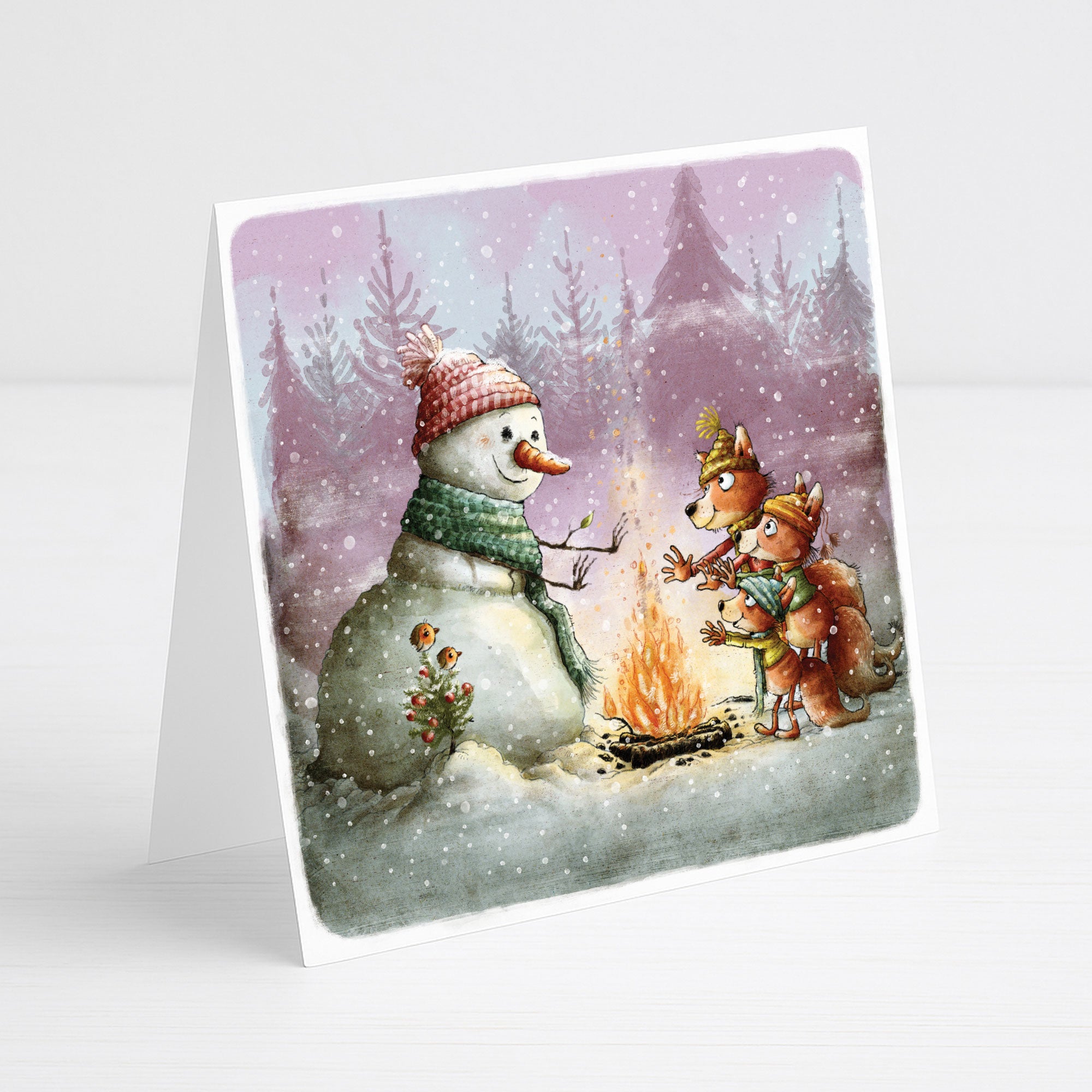 Handgemaakte Wenskaart - Sneeuwman bij het kampvuur
